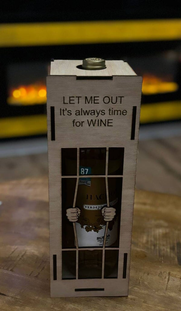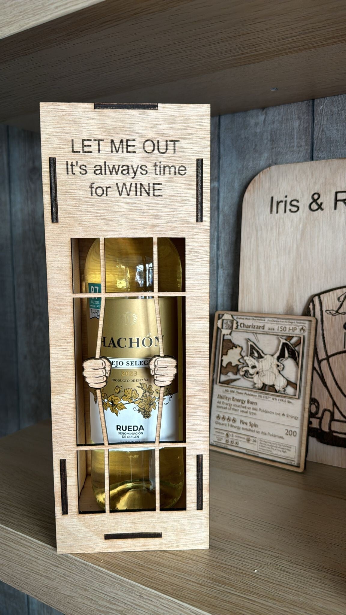Een speelse en stijlvolle toevoeging aan elke wijnliefhebber: deze houten wijnhouder zet je favoriete fles achter tralies met een knipoog. De grappige tekst en het unieke ontwerp maken het een perfect cadeau voor verjaardagen, housewarmings of gewoon om iemand (of jezelf) te laten glimlachen. Een echte blikvanger die humor en gezelligheid samenbrengt.